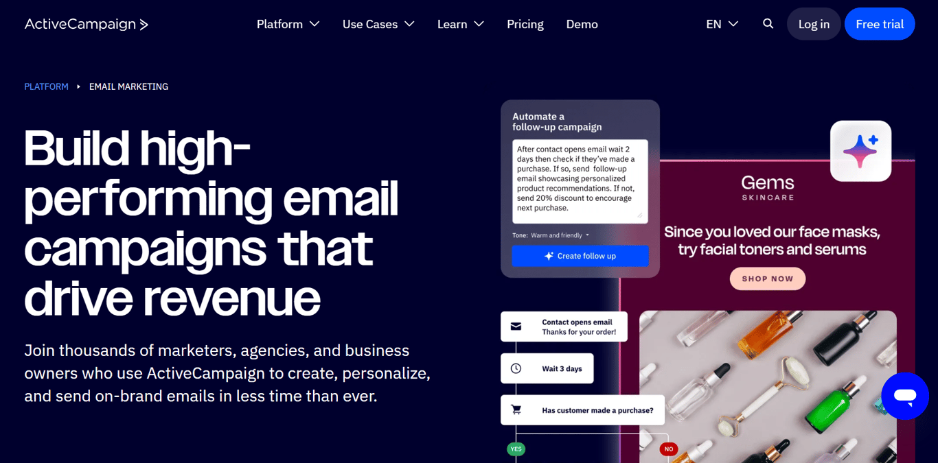 ActiveCampaign is built for marketers who are ready to move beyond basic email campaigns and explore deeper automation. The platform positions itself as a powerful marketing engine rather than a simple email sender.