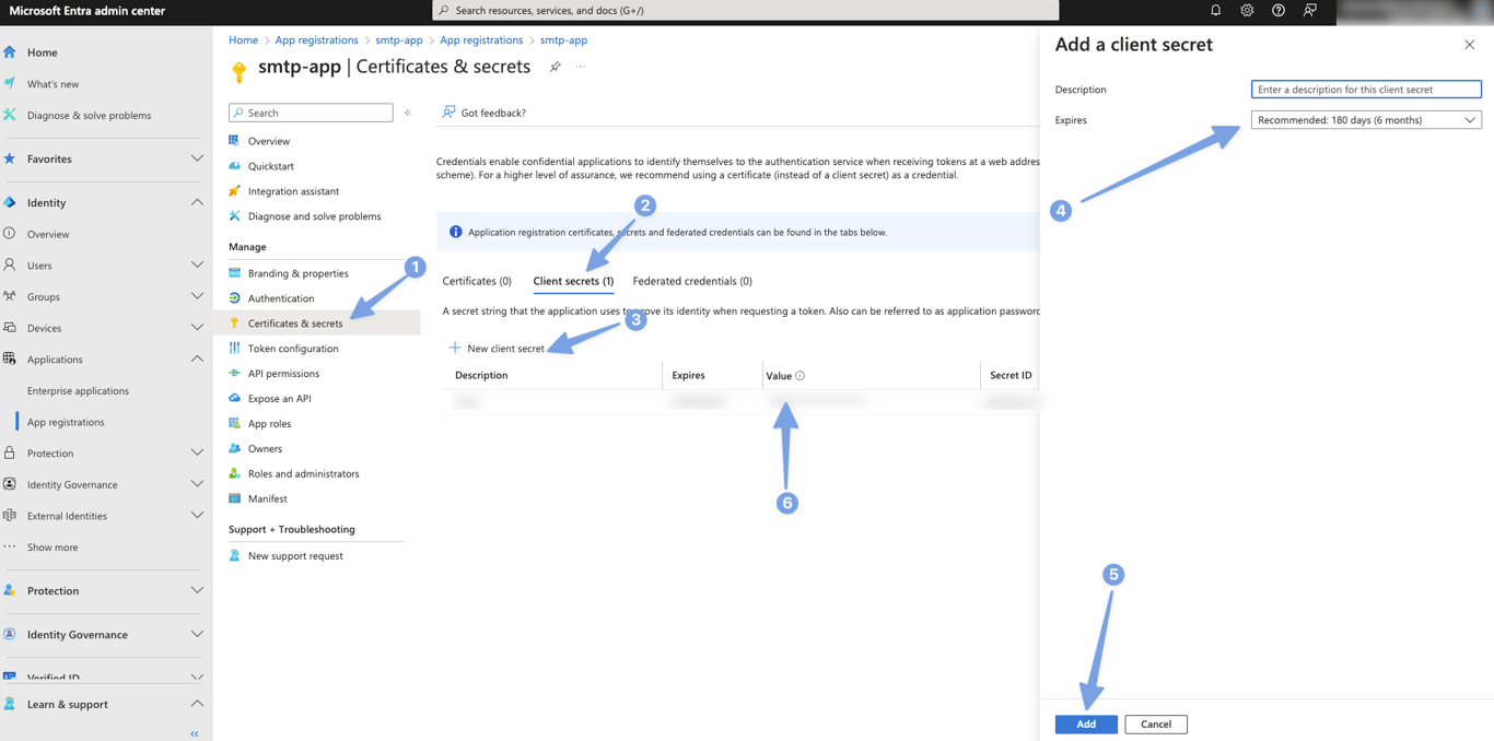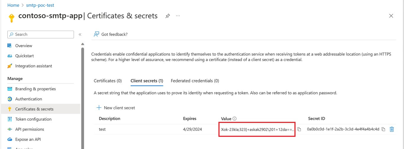 Step 3.6: Store the secret securely: Once the secret is created, immediately copy the "Value" and store it in a secure location. This will be used as part of your SMTP credentials later.
