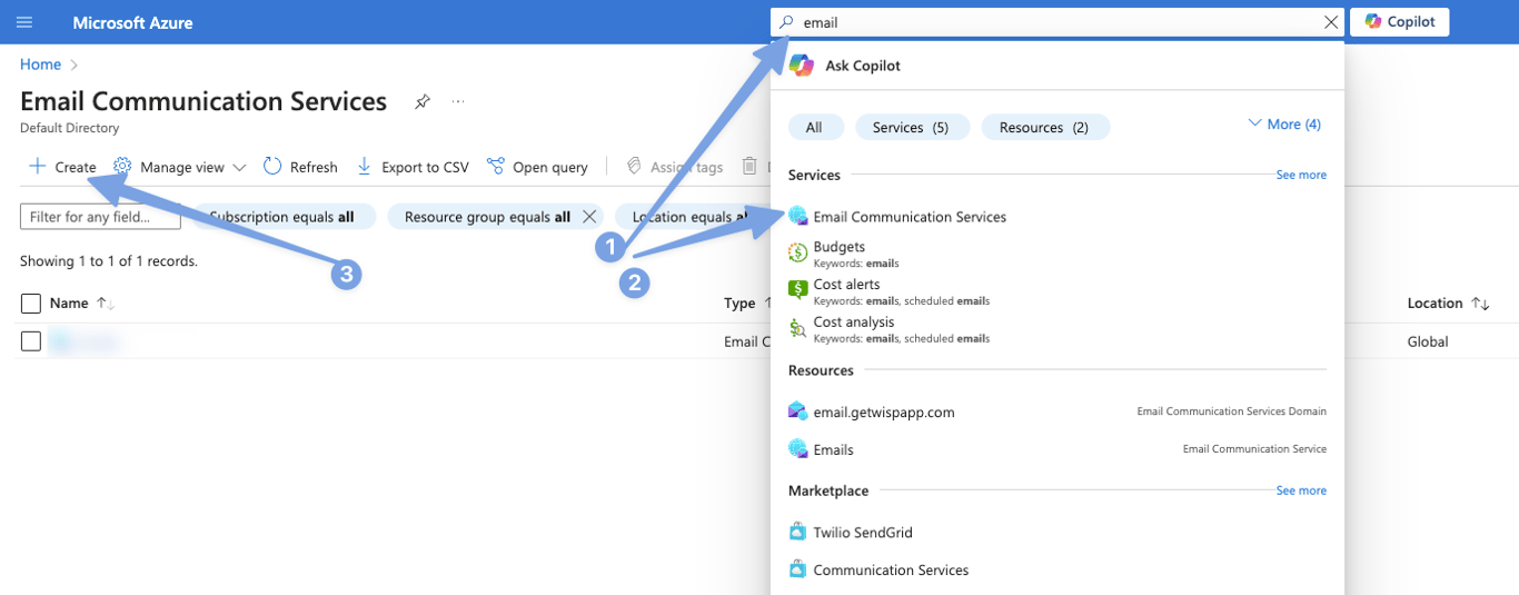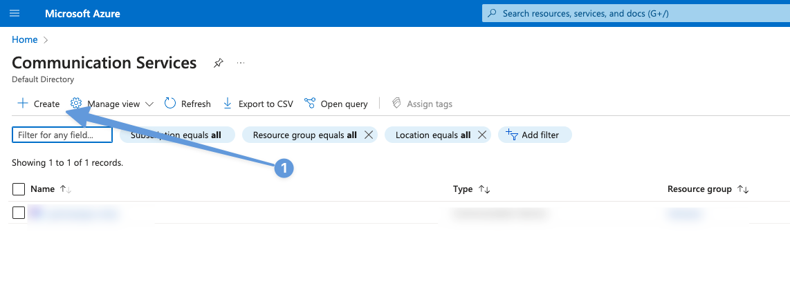 Step 1.3: Create a new service: Click on "Create" to set up a new Email Communication Service. The provisioning process typically takes 1-5 minutes.
