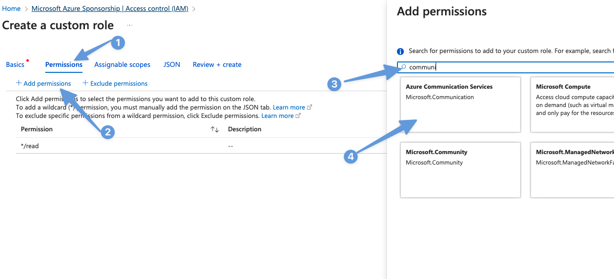 Step 4.5 Add permissions: Click on "Permissions", then "Add permissions". Search for "Azure Communication Services".