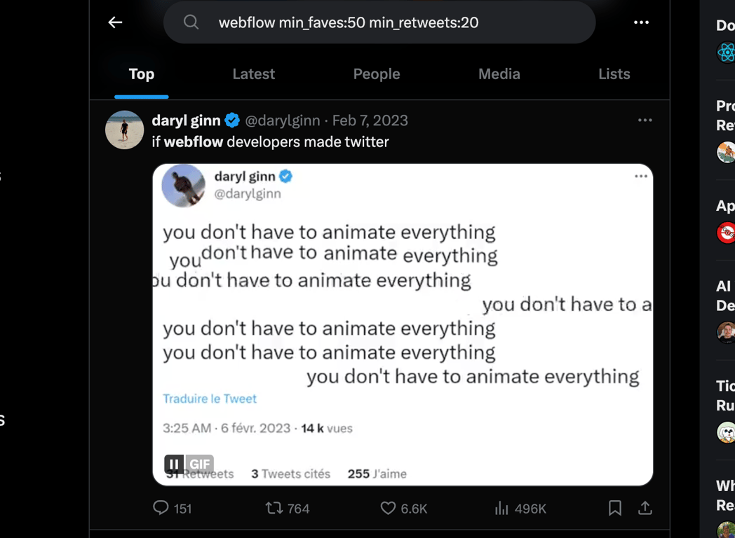 Pro-Tip: Use Twitter's advanced search operators to find high-engagement accounts and content. Search queries like "webflow min_faves:50 min_retweets:20" will surface popular tweets in that space.