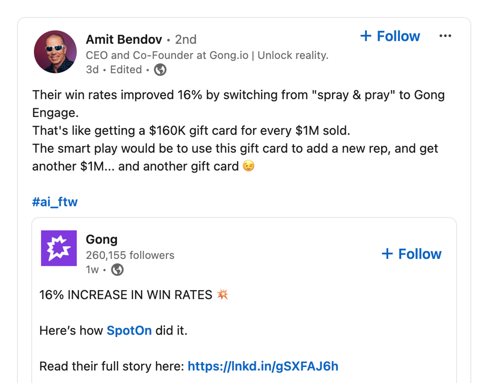 LinkedIn thought leadership played a crucial role in Gong's content strategy. CEO Amit Bendov and other executives regularly shared insights and tips on the platform, helping to build Gong's brand and establish personal connections with potential customers.
