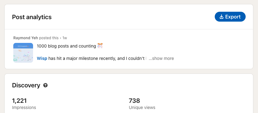 For example, just 2 weeks ago, I had hit 1000 blog posts on wisp and I thought it would be cool to see who are using it. Instead of just celebrating internally, I jotted down the details in my notebook. This later became a LinkedIn post about milestone and the insights from my customers!