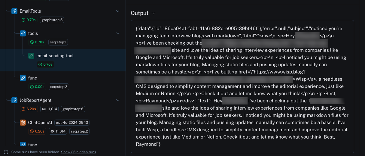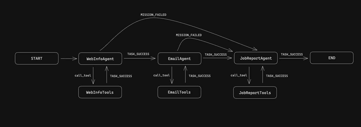Finally, the JobReportAgent documented the entire process, filing summaries into a database to track which emails were sent, any failures, and other relevant data.