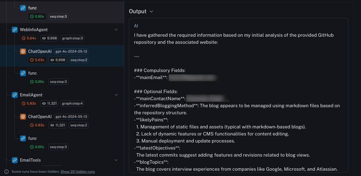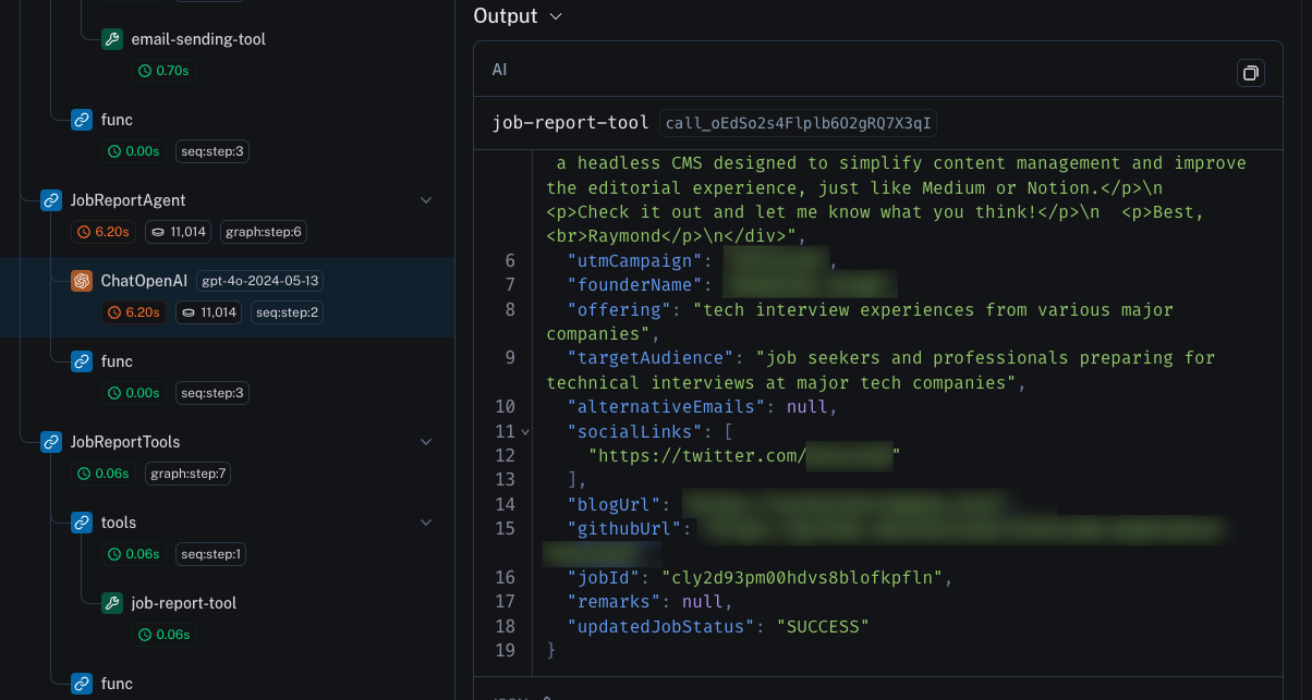 From a technical standpoint, I used tools like LangChain's LangGraph for building the AI agents, LangSmith for monitoring and observability, and supabase's database to manage jobs and reports. The scripts were written in Node.js and TypeScript.