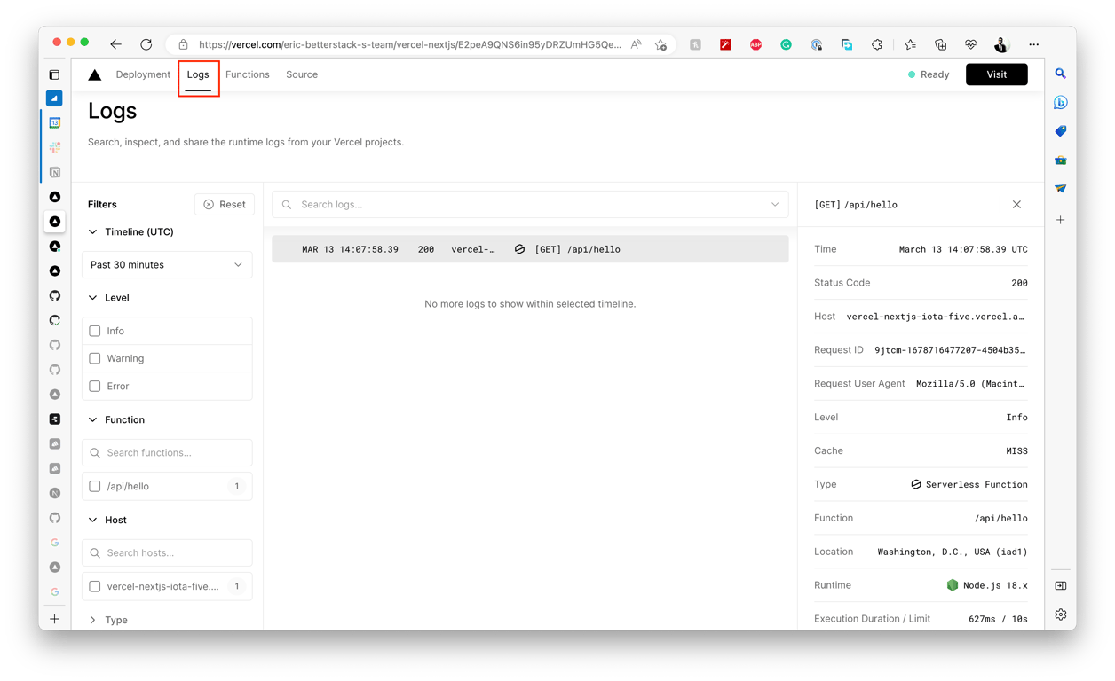 Runtime logs capture HTTP requests and serverless function execution during your application's operation. These are the most important logs for debugging production issues and include: