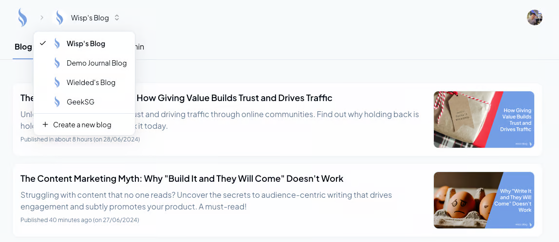 Centralized ManagementManaging multiple blogs from a single account can save you a significant amount of time and effort. For example, Wisp CMS offers a multi-tenancy feature that allows you to manage various projects from one dashboard. This is particularly useful for indie hackers with multiple projects, SEO agencies handling several clients, or anyone with diverse interests.