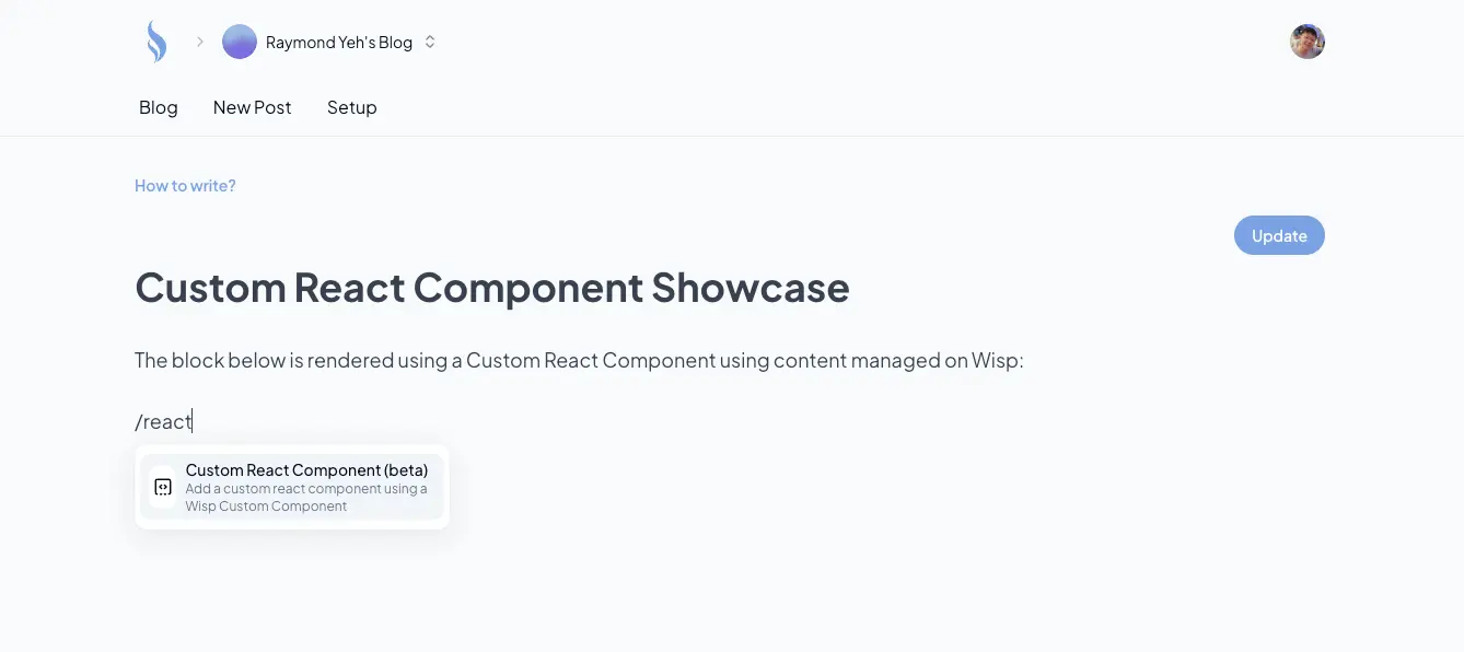 I'm thrilled to share an exciting new feature we've just rolled out at Wisp. I've been listening to your feedback, and I'm pumped to introduce custom React components for your blog posts. This is a game-changer, and I can't wait to tell you all about it!