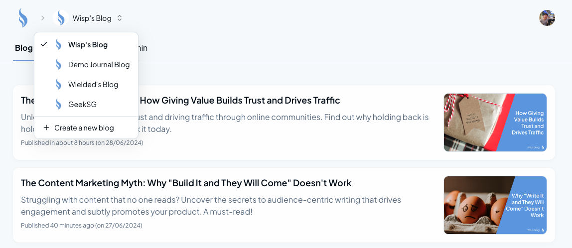 Simply put, multi-tenancy allows you to manage multiple blogs from a single wisp account. Whether you're an indie hacker with various projects, an SEO agency handling multiple clients, or just someone with diverse interests, this feature lets you switch between different blogs seamlessly.