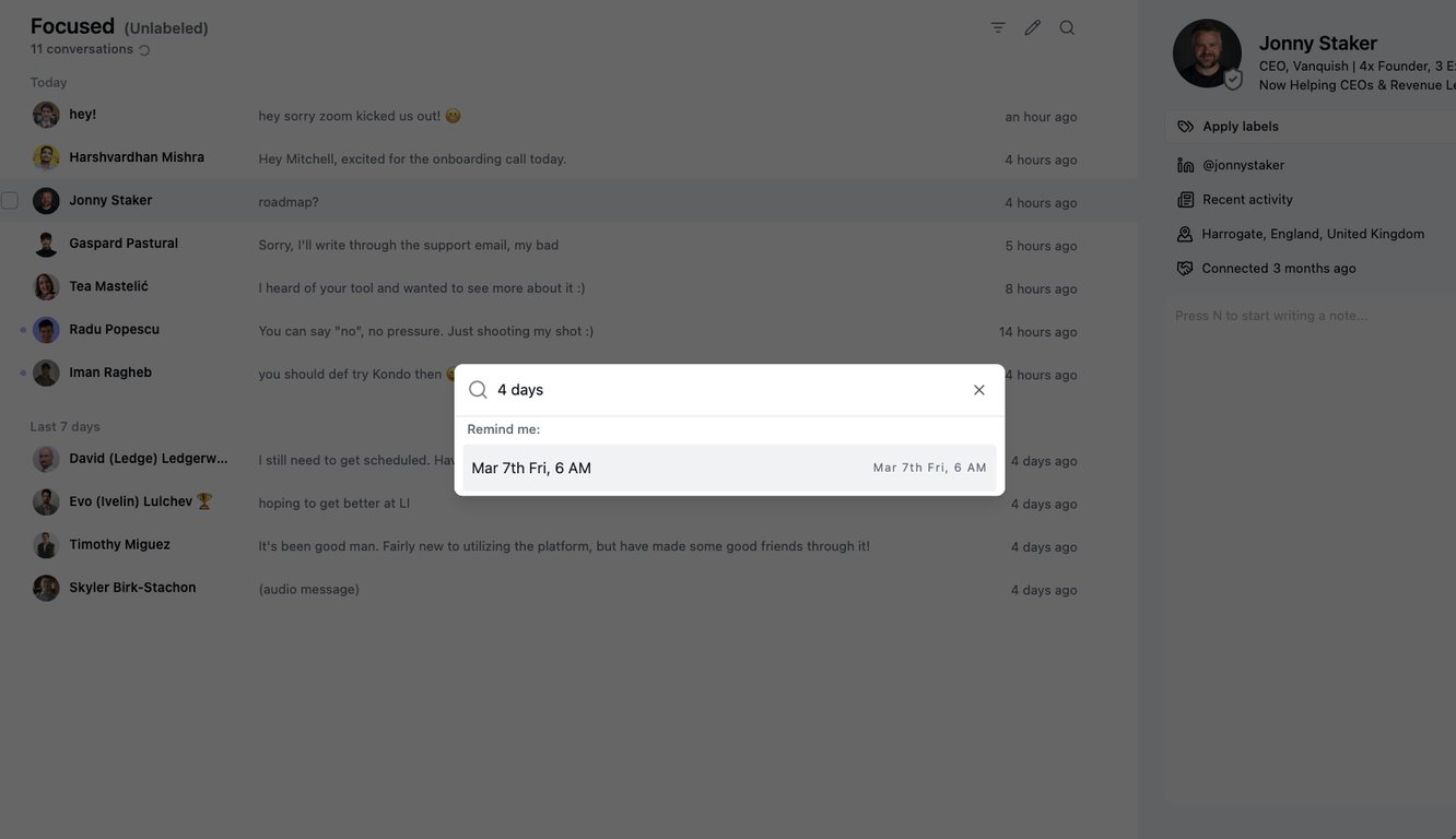 This solves one of the most common problems in professional networking: forgetting to follow up. Whether you're waiting for a response, planning to check in next week, or scheduling a quarterly touch-base, Kondo ensures the conversation resurfaces exactly when needed.