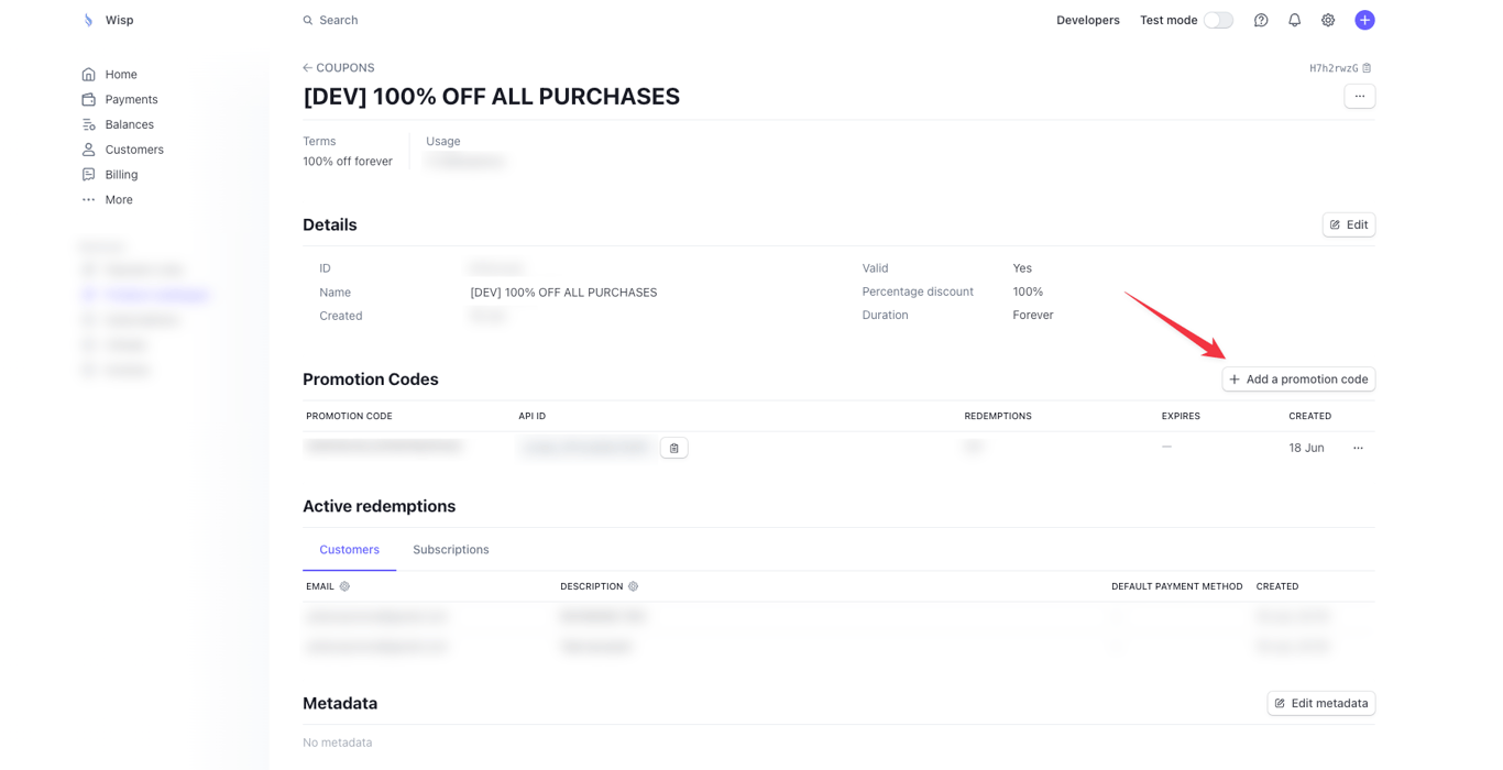 In your Stripe dashboard, navigate to the "Coupons" section and click on the coupon you created earlier (e.g., "Test Coupon").