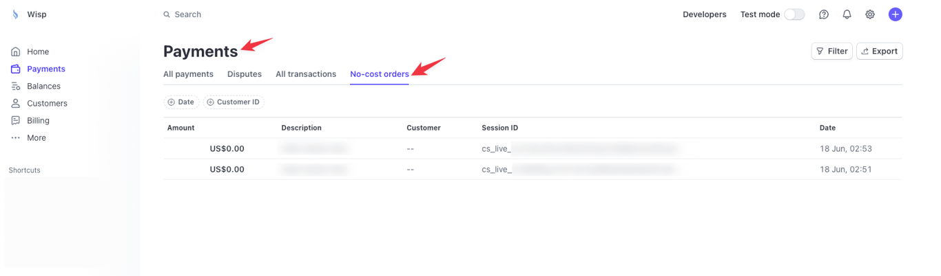 You'll see a tab labeled "No-cost Orders" if you have any completed test orders using the 100% off coupon.