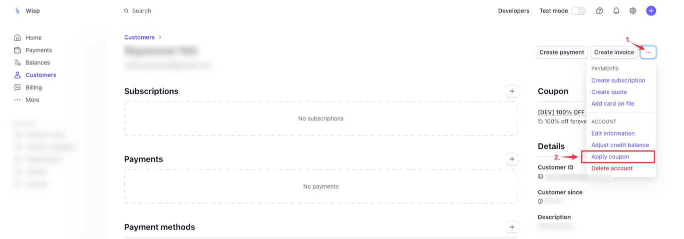 Alternatively, if your integration doesn't support entering promotion codes during checkout, you can create a test customer in your Stripe dashboard and directly attach the coupon to their account. Here's how: