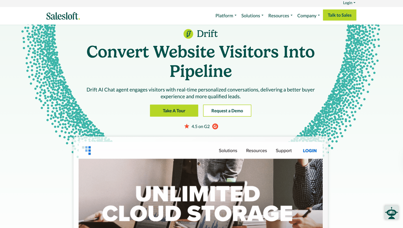 Drift uses AI-powered chat to engage visitors as they browse. It qualifies intent through structured questions and routes high-value prospects to the right path without requiring a sales rep to be present.