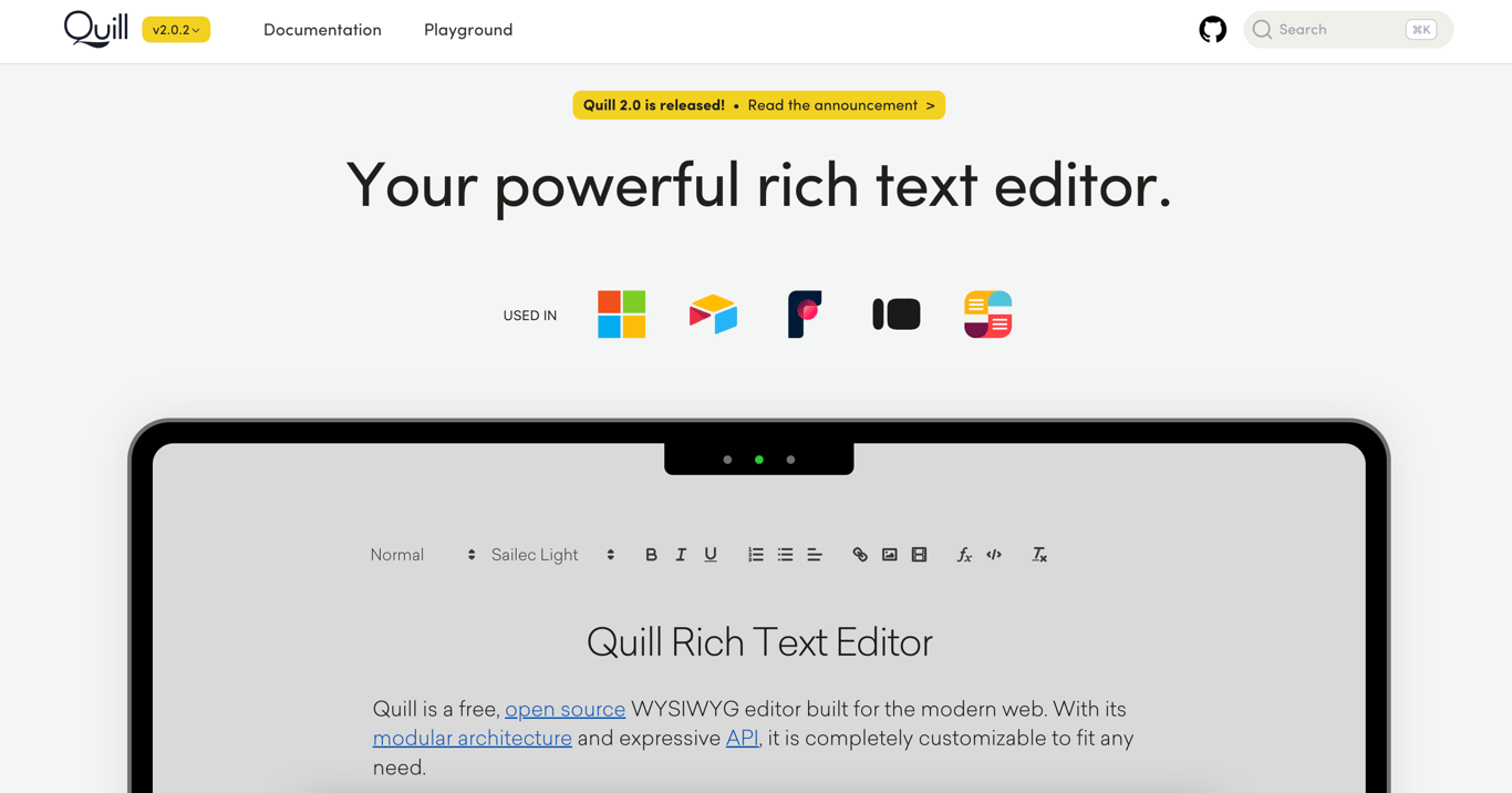 Quill is an open-source, modular editor that provides cross-platform support and a developer-friendly API. It is ideal for those needing a flexible and free text editor.