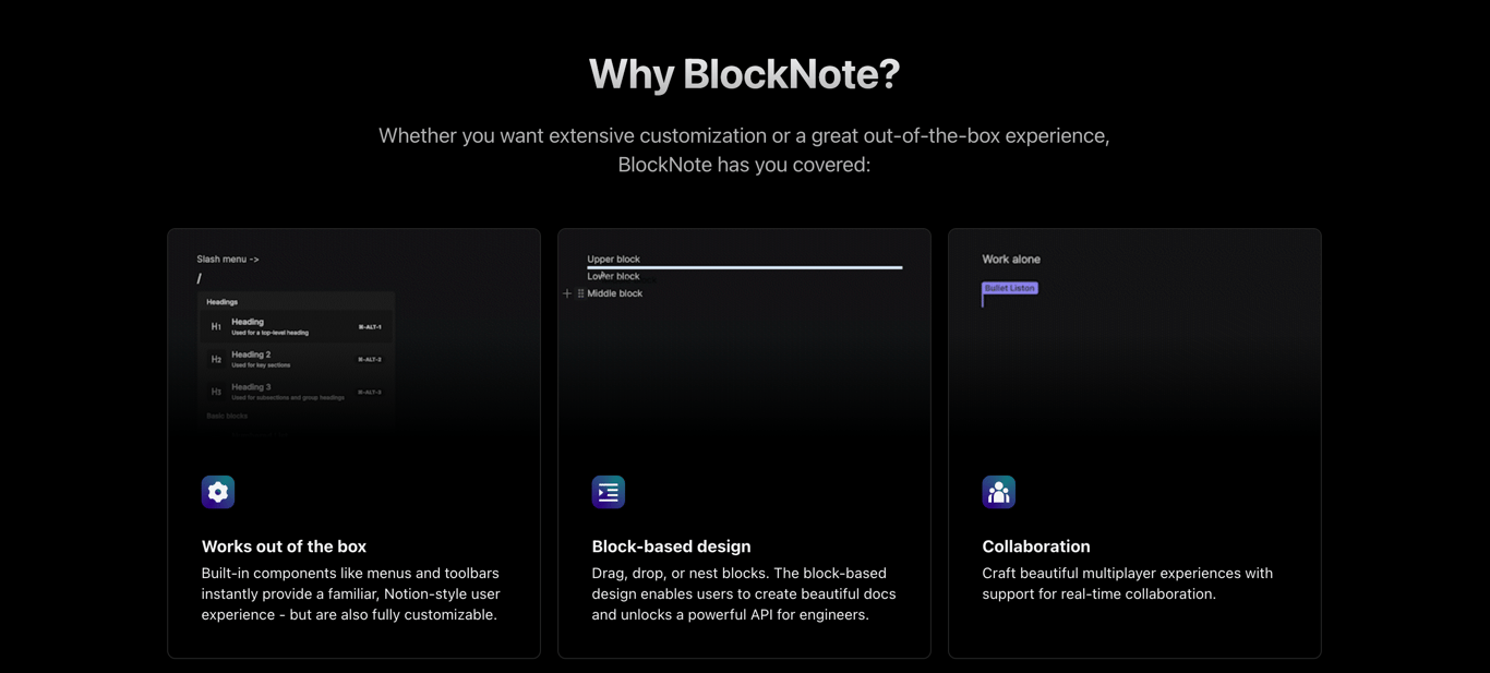 BlockNote offers out-of-the-box functionality with robust customization and real-time collaboration, ideal for developers seeking an easy-to-use yet highly customizable editor.