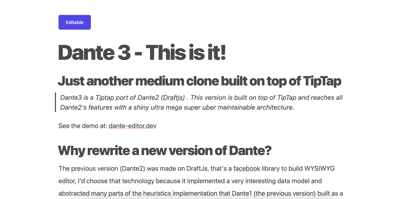 Dante3 is a WYSIWYG (What You See Is What You Get) editor for React, inspired by Medium's editor. It is built on top of ProseMirror's TipTap, offering a more maintainable architecture compared to its predecessor, Dante2, which used DraftJs.