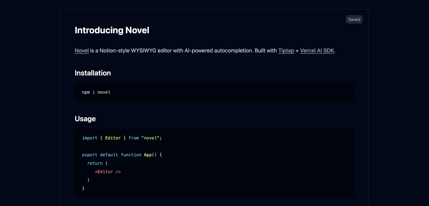 Novel is a Notion-style WYSIWYG editor with AI-powered autocompletions, designed for usage within React applications. It is built with Tiptap and the Vercel AI SDK.