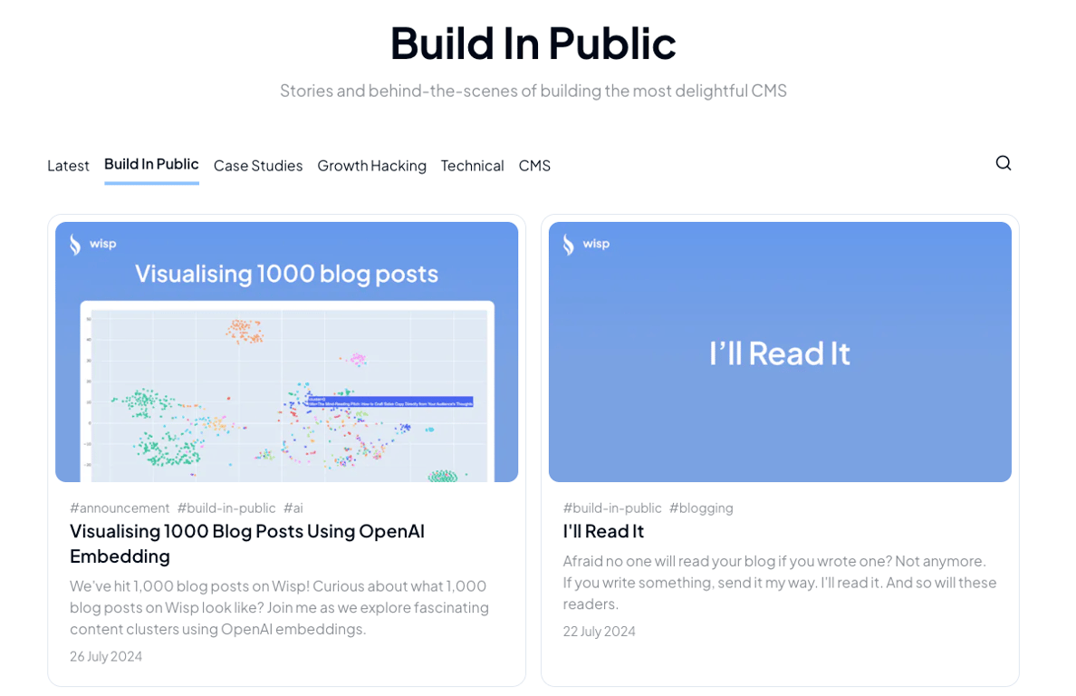 New Blog Style: We've revamped the Wisp's blog with different sections catering to various reading preferences, including a "Build in public" section for our build-in-public posts.