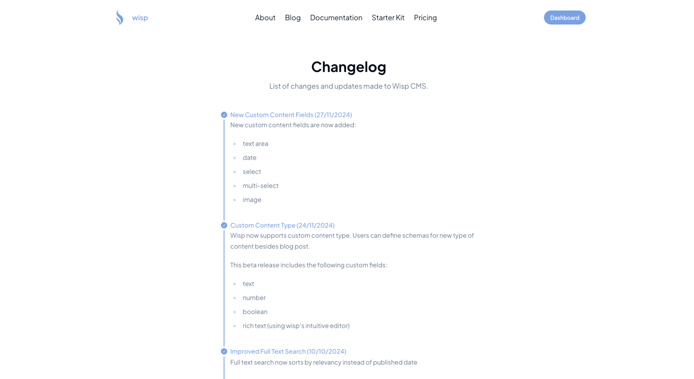 By following this guide you can efficiently implement a changelog system into your Next.js application using WISP CMS. This setup not only makes it simple to announce updates to your users, but it also offers a clean, organized presentation using custom UI components. Whether for software updates, product announcements, or internal tracking, a changelog keeps your users engaged and informed.