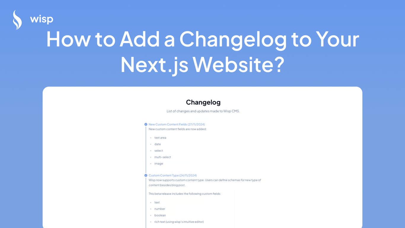 Keeping your audience informed about the latest updates and changes to your software is crucial. One effective way to do this is by adding a changelog to your website. In this guide, we'll explore how to integrate a changelog into your Next.js website using Wisp, a content management system designed for modern applications. By the end of this post, you'll be able to create and display a dynamic changelog using Next.js and WISP.